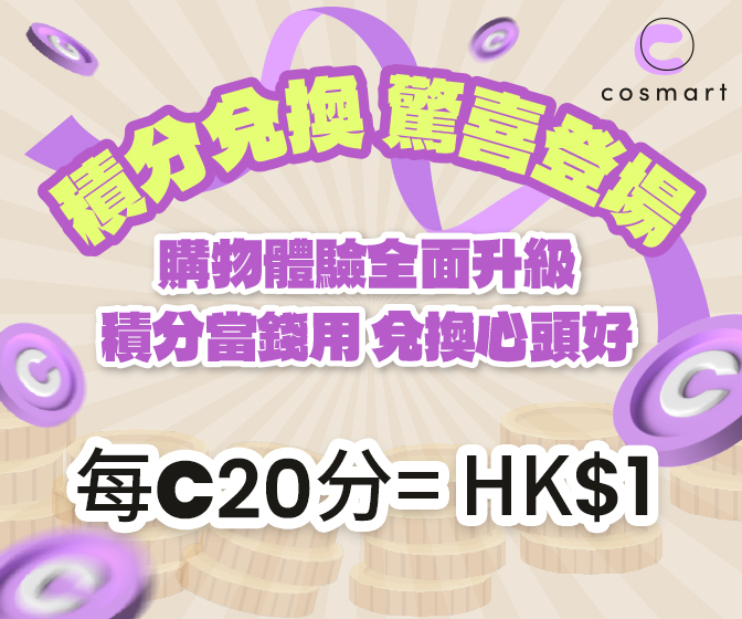 積分可於會員獎賞計劃平台內換取不同類別的精選禮品、優惠券、試用裝及體驗活動等,更可以換取現金券到 Cosmart Shop 購物!